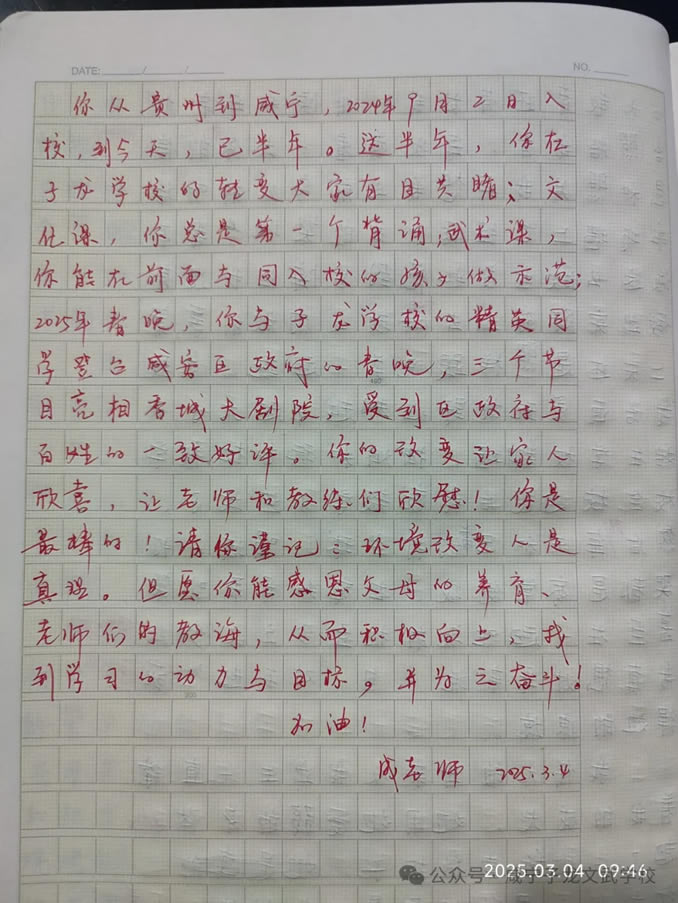 該學(xué)生于2024年9月2日入學(xué)子龍學(xué)校,當(dāng)時(shí)染黃頭發(fā),因長(zhǎng)期打游戲,眼泡腫脹,骨瘦如柴,在陳子龍校長(zhǎng)、成麗老師、時(shí)教練等悉心教導(dǎo)下,反省曾經(jīng),努力上進(jìn),于2024年10月25日在長(zhǎng)沙岳陽(yáng)樓研學(xué)時(shí)全文背誦《岳陽(yáng)樓記》,以滿分免了門票,讓同學(xué)們刮目相看,從而有了深深的自豪感;在咸安區(qū)2025年春節(jié)團(tuán)拜會(huì)上,他和子龍學(xué)校的同學(xué)以三個(gè)節(jié)目亮相春晚開場(chǎng)、中場(chǎng)、壓軸舞臺(tái),贏得了區(qū)委區(qū)政府領(lǐng)導(dǎo)和社會(huì)的廣泛贊譽(yù);平時(shí)上課,他主動(dòng)學(xué)習(xí),總是第一個(gè)背課文,精益求精,默寫生字難字,默寫古詩(shī)文。寫作文、造句等,十分用心用情,經(jīng)常被老師在班上當(dāng)成范文誦讀。武術(shù)課,他勤學(xué)苦練,掌握要領(lǐng),很快就出類拔萃,當(dāng)上了副班長(zhǎng)。神速的進(jìn)步讓家長(zhǎng)十分滿意,同時(shí)對(duì)學(xué)校充滿了感激之情。