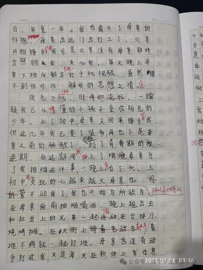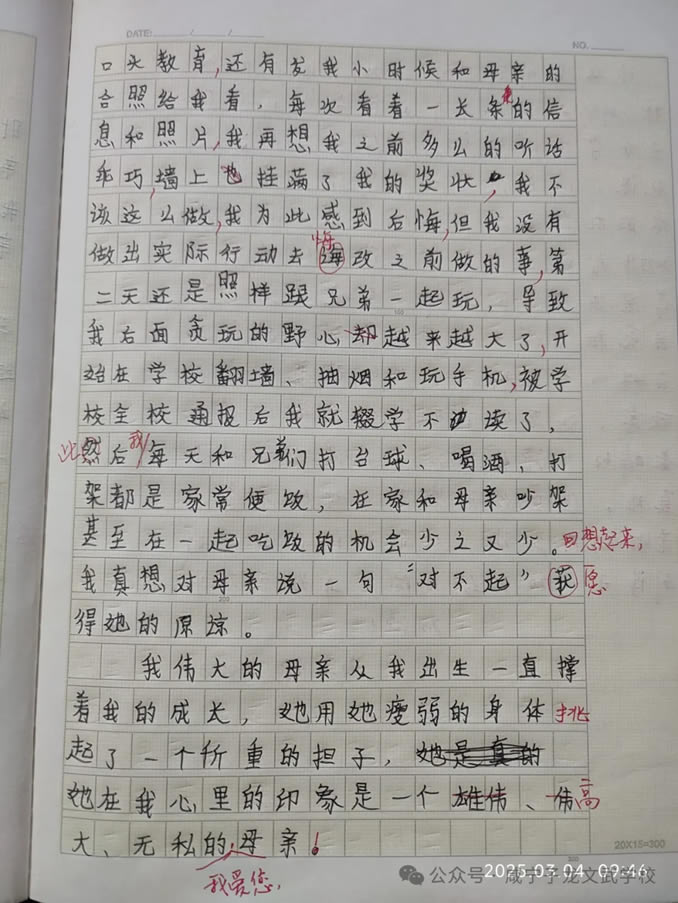 3月4日,成麗老師在批改作文時(shí),一貴州籍學(xué)生寫的題為《偉大的母親》,讓成老師感動(dòng)不已:感動(dòng)于學(xué)生的母親為了兒子嘔心瀝血的付出;感動(dòng)于迷惘少年入學(xué)子龍半年后的深刻感悟;驚喜于該學(xué)生入學(xué)半年能在子龍學(xué)校大熔爐里得到質(zhì)的轉(zhuǎn)變,從之前不愛學(xué)習(xí)與外面不良青年喝酒飆車打架,稍不如意對(duì)父母的拳打腳踢,短短半年,已經(jīng)脫胎換骨勵(lì)志向上。作為他的班主任,成老師亦心潮澎湃,作了洋洋灑灑的批改,感恩子龍學(xué)校為社會(huì)為眾多家庭做出的貢獻(xiàn)!